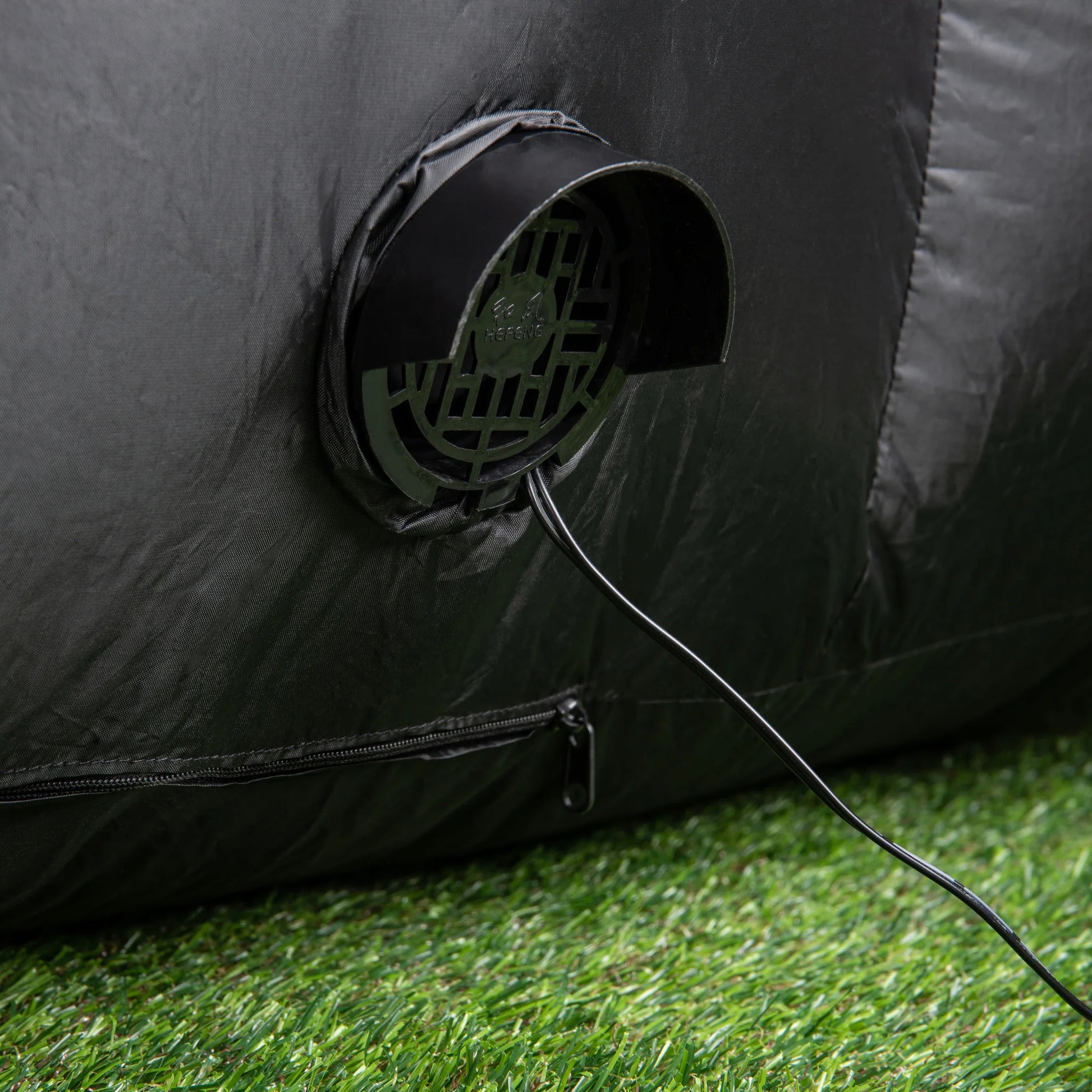 Inflatable includes built in LED lights, blower fan, rope, and ground stakes to allow for a quick and easy set up and free plug protector!